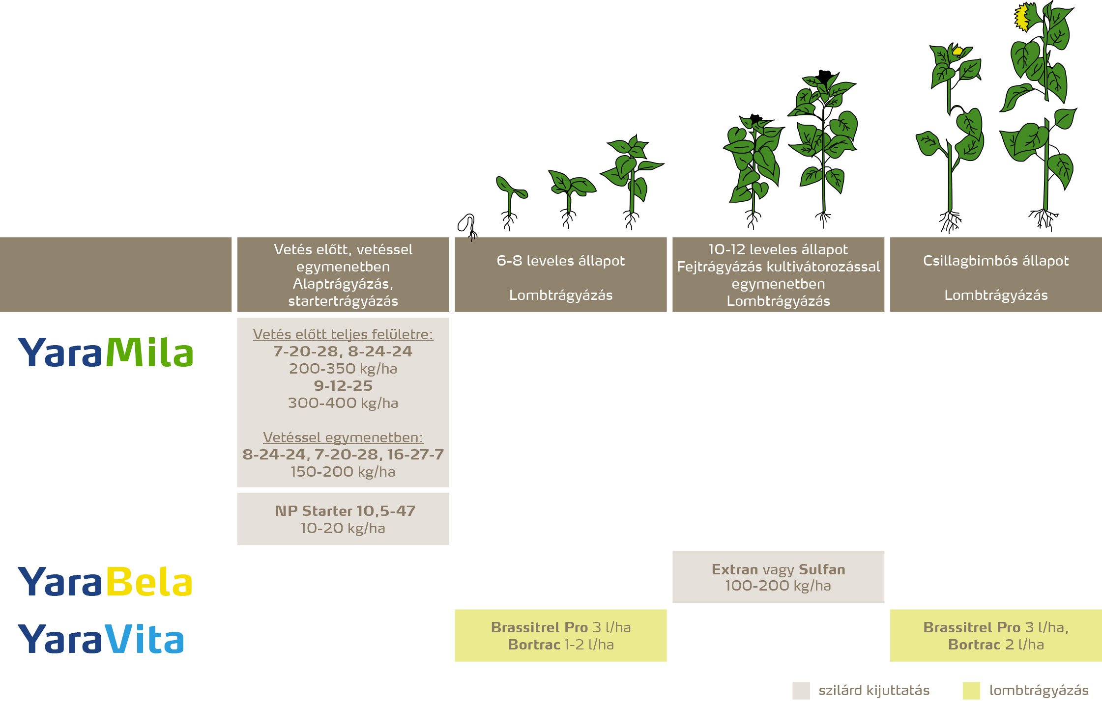 A honlapon közölt információk a Yara legjobb tudását tükrözi, az ajánlásokat a Yara tapasztalatai és kísérleti eredményei alapján állítottuk össze. A nagyobb méretért kattintson a képre, vagy töltse le napraforgó tápanyagellátási programunkat PDF-ben.